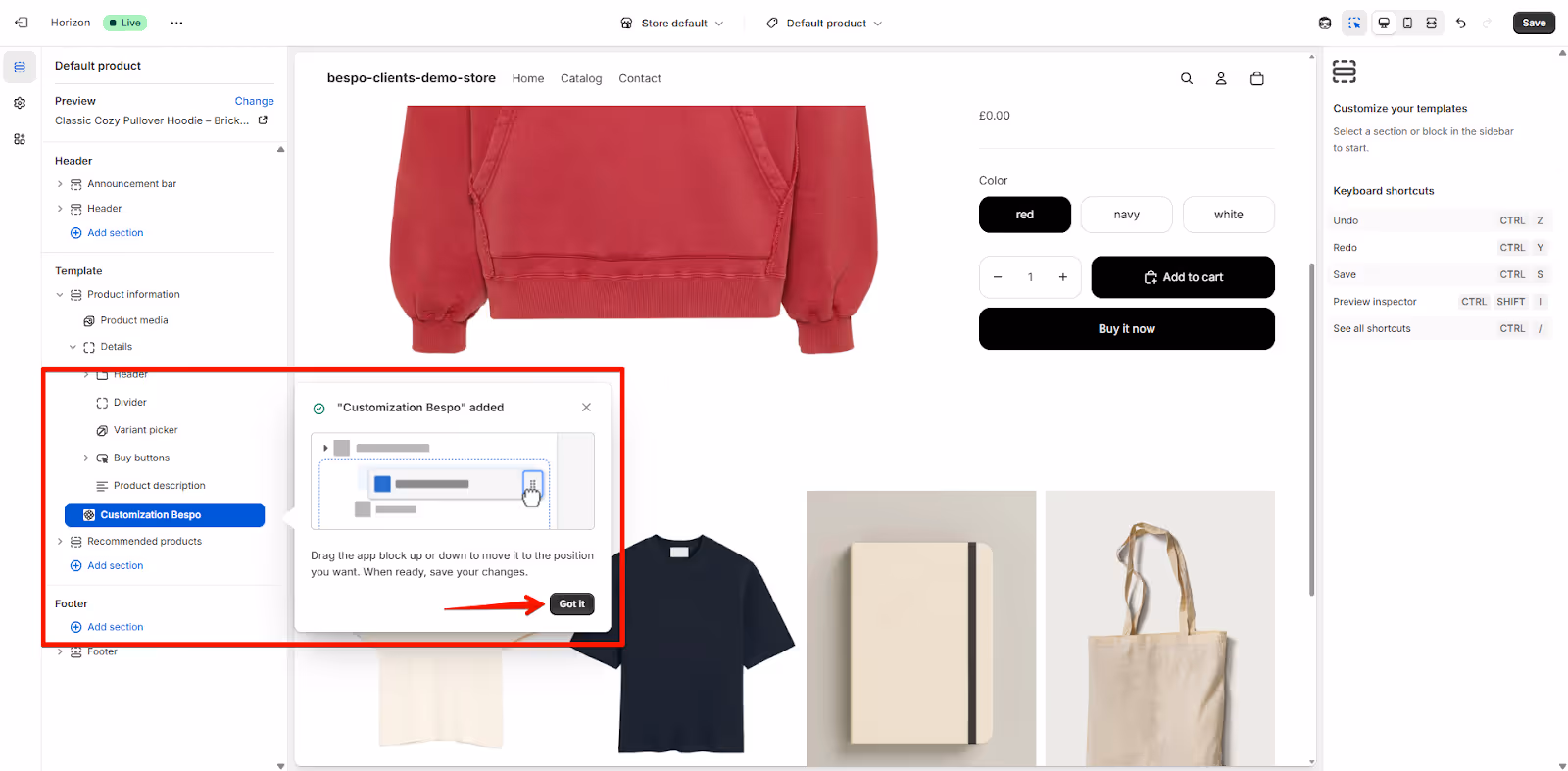 In the Shopify theme editor, you’ll see a confirmation that “Customization Bespo” added. Click Got it.