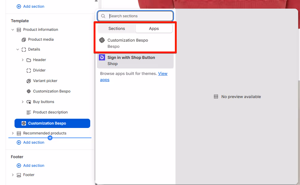 - If you don’t see it, add it manually: in the left sections panel, click Add block → Apps → Customization Bespo.
